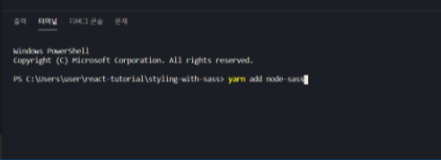 여기서 우리는 한 가지를 더 설치해야한다. node-sass 라는 이름의 라이브러리이다. 이 라이브러리를 설치해야 우리의 프로젝트에서 스타일링을 멋지게 할 수 있다. 폼나는 컴포넌트를 구사할 절호의 찬스이니 조금만 참고 설치해보자.